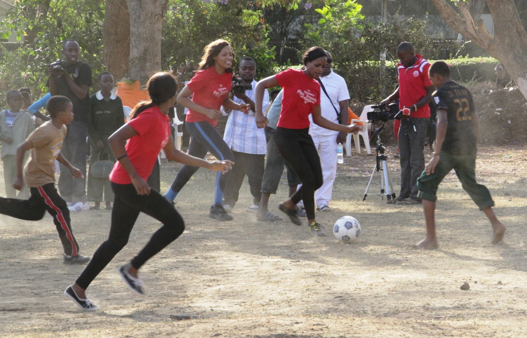 Warembo wa Redd's Miss Tanzania 2012 wakishiriki kucheza mpira wa Miguu na Watoto Yatima kwenye uwanja wa Arusha School katika michezo ya hisani kuchangishdha kwaajili ya kusaidia watoto yatima na waishio katika mazingira magumu.Mbali na michezo pia walishiriki kuosha magari.
